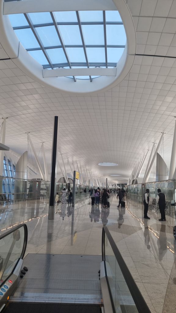 Weiter erläuterte er mir den Unterschied zwischen der Migrations-Politik in Saudi-Arabien und den Vereinigten Arabischen Emiraten (VAE). In Saudi-Arabien könne er als Ausländer weder einen Job beim Staat kriegen, noch eine Wohnung kaufen und erst recht nicht eingebürgert werden. Sprich, das Land funktioniere so, dass der Fokus darauf liege, dass es den Einheimischen gut gehe. So sei es zum Beispiel auch nötig Arabisch zu lernen, um sich im Alltag zu integrieren. In den VAE hingegen liege der Fokus darauf, dass sich die Ausländer:innen wohl fühlen. Das Land passe sich den Ausländer:innen (zu stark?!) an, anstatt die Ausländer:innen, die dort wohnen den lokalen Begebenheiten. Aufgefallen ist mir diesbezüglich das Werbe-Video über die VAE im Flugzeug vor der Landung. Verschiedene Personen aus der Geschäftswelt erzählten darin, wie gut es ihnen in den VAE gefällt, wie fortschrittlich die Dinge laufen und wie sich Investitionen dort lohnen.