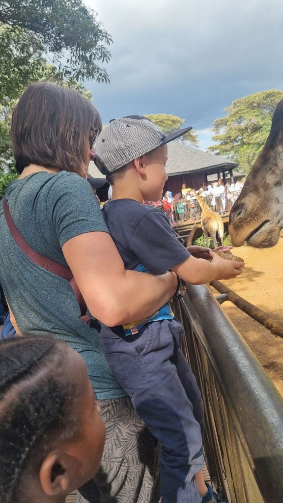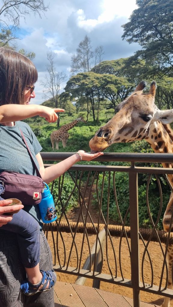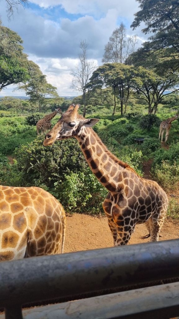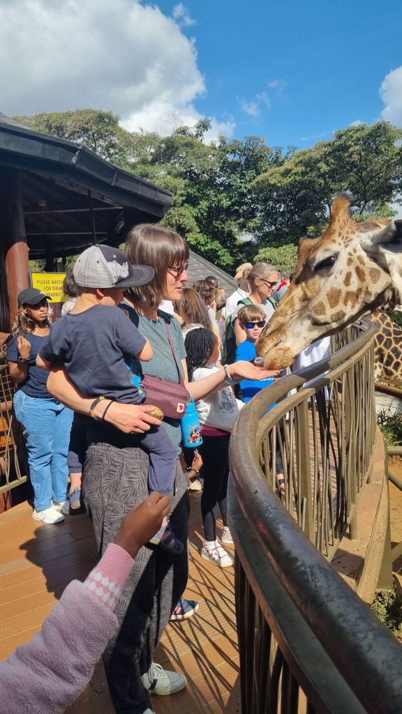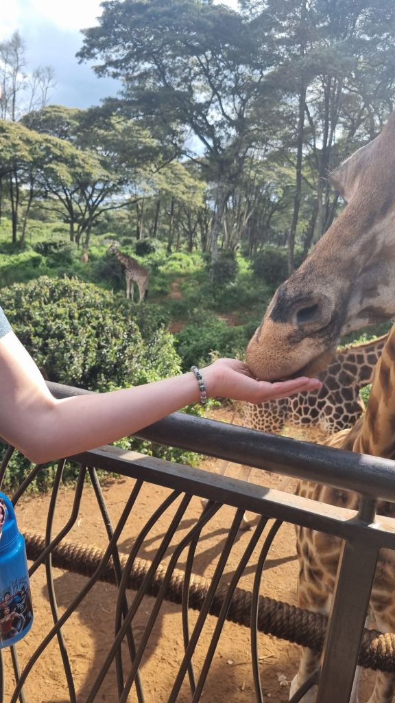 Gestern besuchten wir dann noch das Giraffen Center in Nairobi. Das wurde mit dem Ziel gegründet, die bedrohten Rothschild Giraffen zu schützen bzw. zu züchten. Gleichzeitig gibt es den Besucher:innen die Möglichkeit den Tieren sehr nahe zu kommen (fast zu nahe?!). Das Center ist jedenfalls sehr beliebt, es gab sehr viele Besucher:innen aus aller Welt.